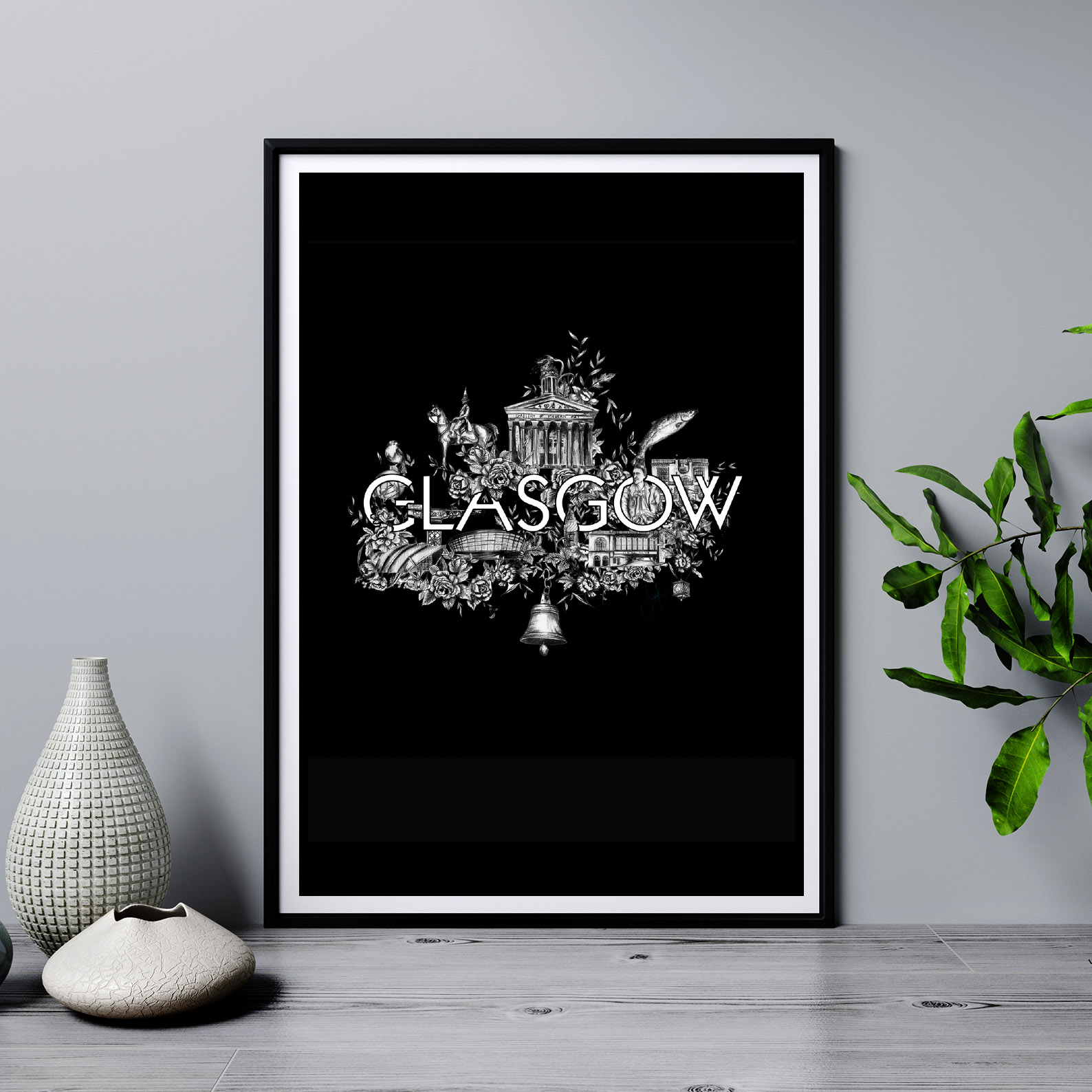 This print includes elements of the Glasgow city emblem (the bird, the fish, the bell and the tree), the Armadillo, The Hydro, Glasgow Central Station, Charles Rennie Mackintosh, Glasgow School of Art and some other little icons of the city.